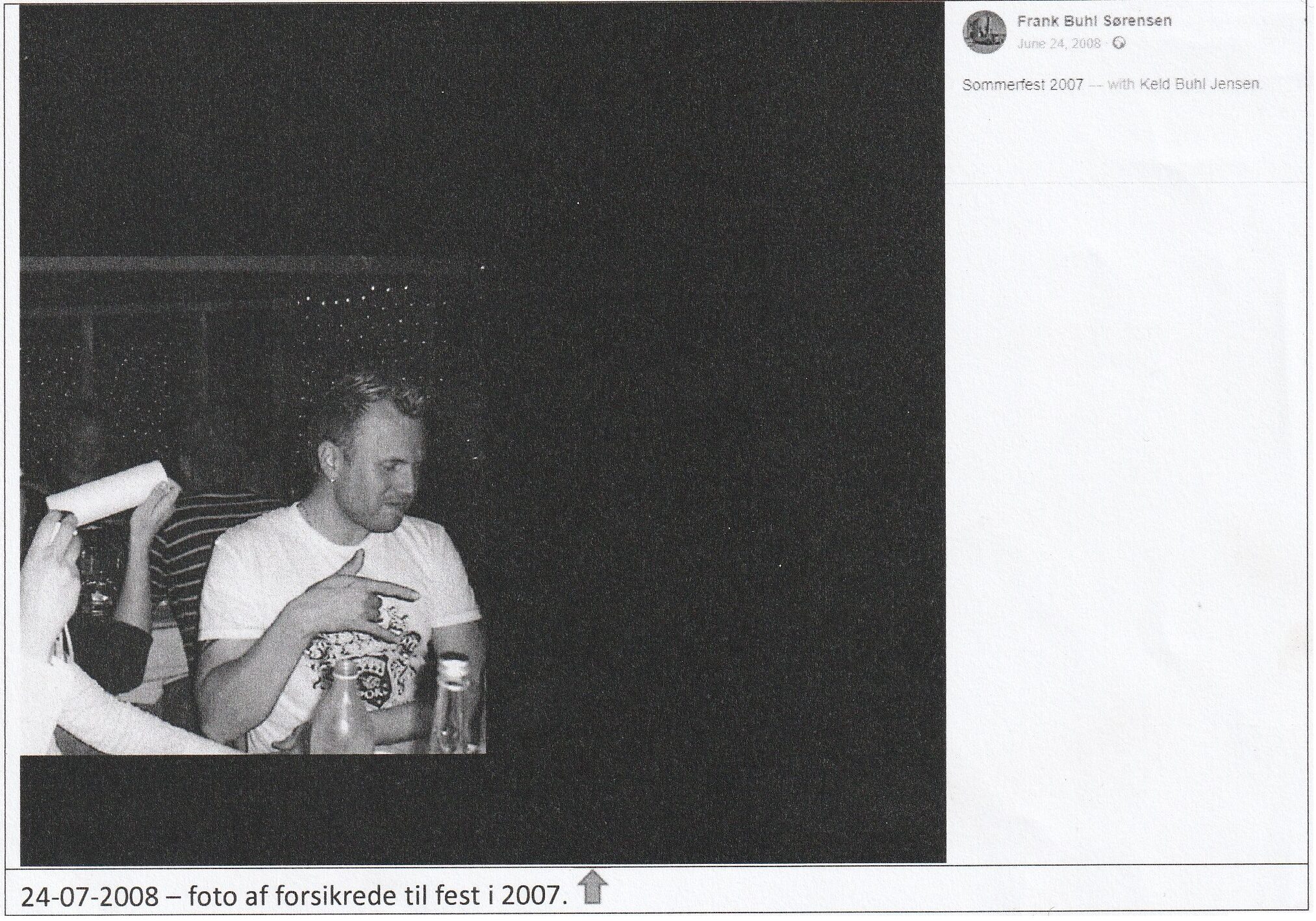 Hvad gavner et billede af mig til en fest i 2007? Det er flere år før, at jeg tager brug af min forsikring. Og i tilfælde af, at jeg havde taget brug af min forsikring, så formoder jeg, at det er fordi I ikke ser, at man har social omgang med andre mennesker, hvis man er syg. Eller forklar? Vi lytter! For I kan på ingen måder komme med bare skyggen af god forklaring på, hvad dette fuldstændige nytteløse billede skal i sagen!
