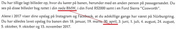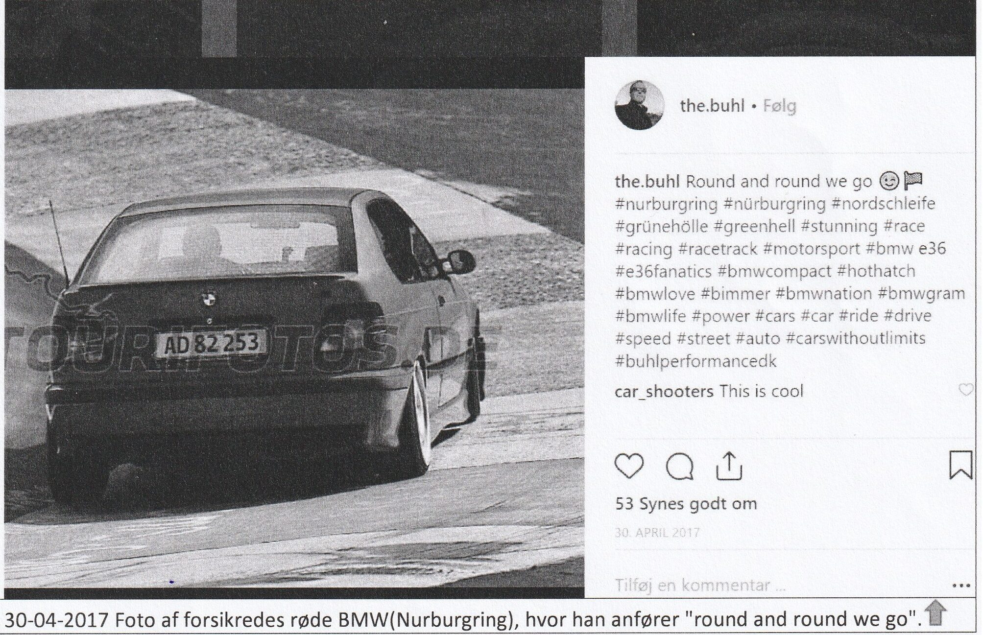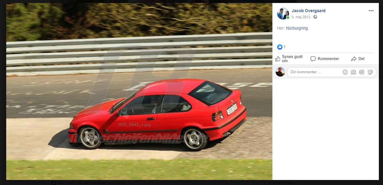Og dagen forinden, altså den 29.04.2017 der dokumenterer min gps, at kører jeg til Fyn. Og dagen efter, altså den 01.05.2017 der dokumenterer min gps, at er jeg ude og køre med en veninde. Hun poster tilmed billede på nettet af, at hun kører i min røde BMW hvor med ovennævnte Jacob Overgaard omkring dette. Skulle det være nødvendig sender jeg dette billede til jer, med hendes accept.