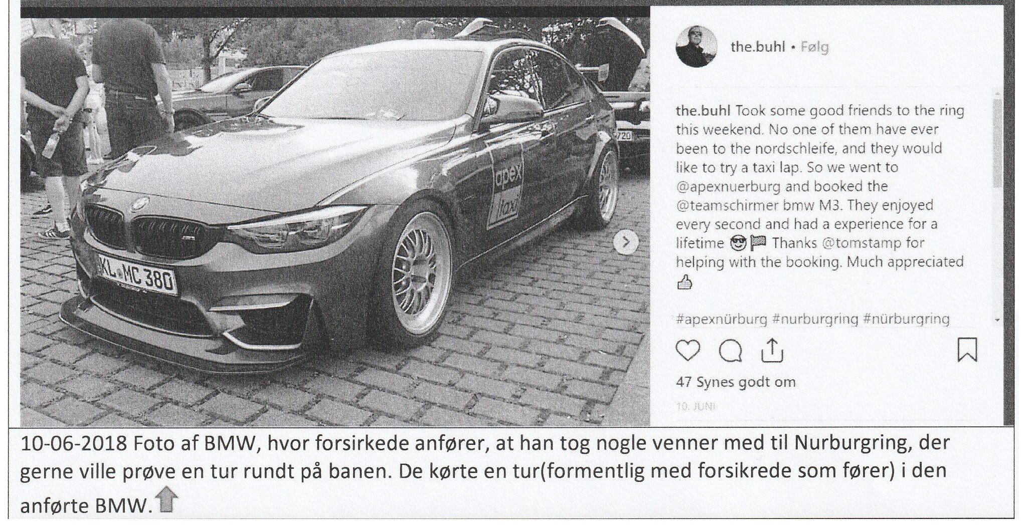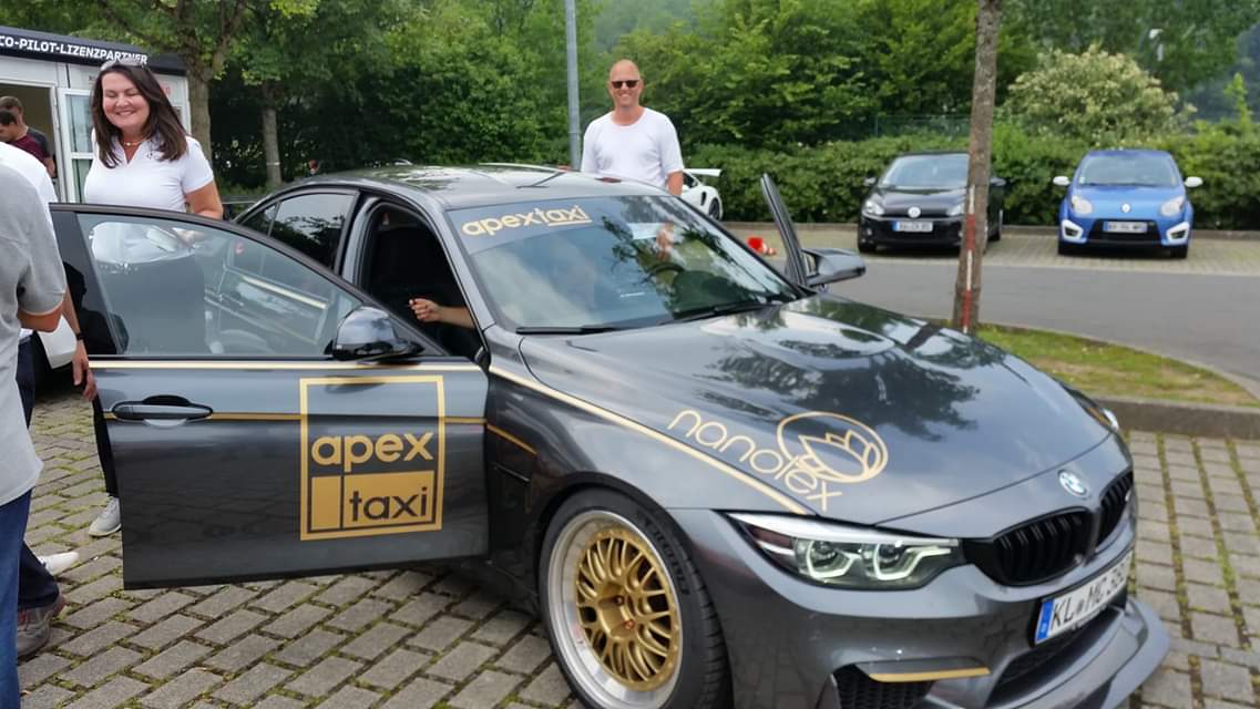 Jeg skriver endda hvor bilen er lejet. Nemlig hos Apex Nürburg. Hvilken verden lever I i, hvor man som privatperson må køre en taxi uden licens? Husk nu, at vi har med en offentlig vej at gøre! Og især, når man tænker på, at det er en bil, som fuldt læsset vejer 2 tons med på den gode side af 500 Hk og 800 Nm. Det kræver i den grad licenser og kørefærdigheder, som jeg på ingen måder besider!