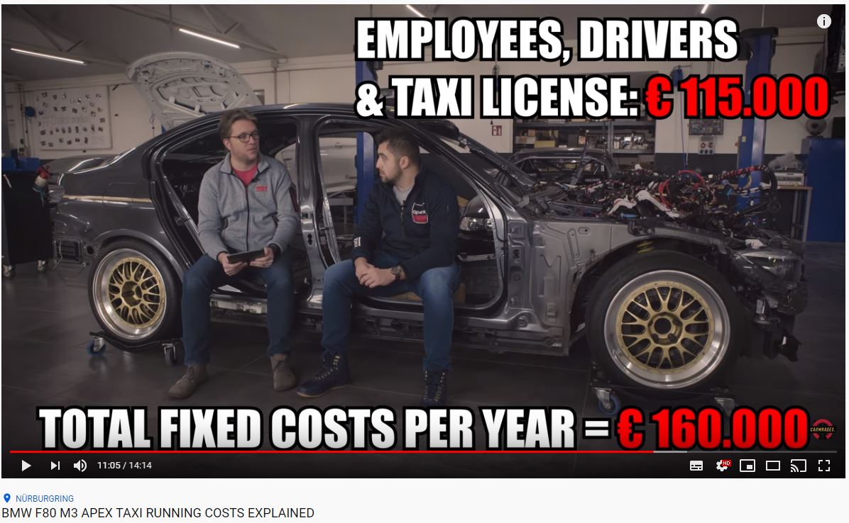 Og ved 10.50 minutter beskriver han nogle omkostninger omkring bilen. Bl.a. ansatte, kører og taxi licens til bilen. Den er registreret til taxi kørsel og medarbejdere SKAL have speciel racer taxi licens, for at må køre bilen med passagerer.