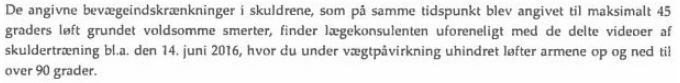 Hvilke samtidige angivelser omkring 45 graders løft fra juni 2016 refererer Velliv til? Dem vi har, og som selskabet har sendt til os, er tilbage fra den 22. september 2015, som er 9 måneder forinden. Der angiver KBJ stærke skuldersmerter ved cirka 45 grader. Forløbet fra september 2015 til juni 2016 beskrives i punkt 21 hvor Velliv og speciallægekonsulenten tager ordet uvidenhed til nye højder!