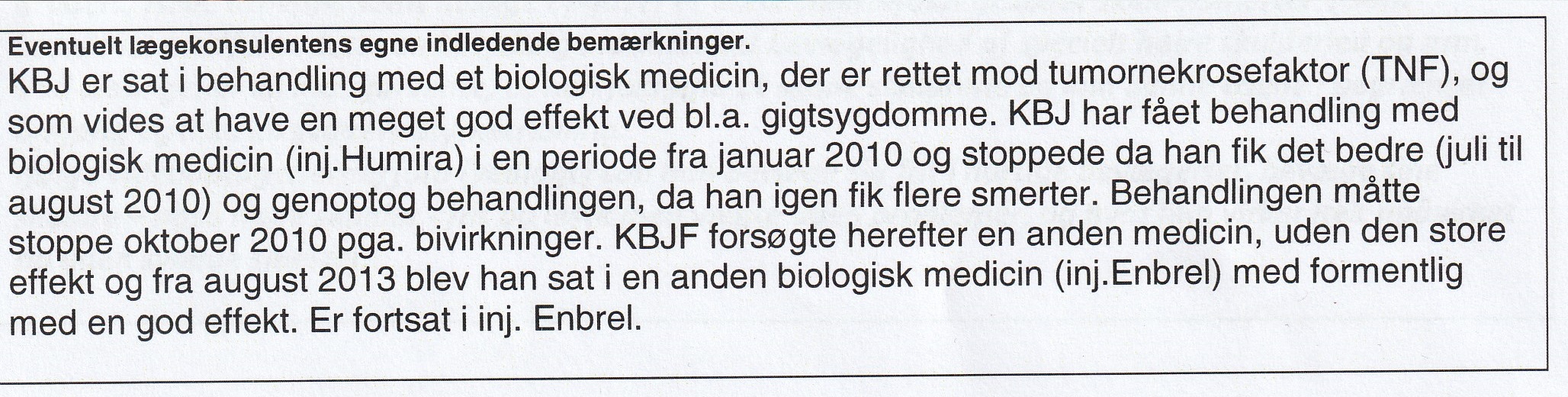 Vi er dybt rystet over den sidste sætning. ”Fra august 2013 blev han sat i en anden biologisk medicin (inj.Enbrel) med formentlig med god effekt”. Vi bemærker straks sætningen – Er fortsat i inj. Enbrel”. Dette kan ikke være mere himmelråbende forkert!? Hvis der ønskes fuld dokumentation for dette henvises til punkt 25.