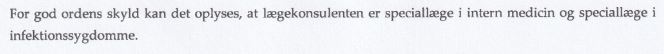 Efterfølgende har Velliv erkendt, at lægen har speciale i infektionssygdomme, hvilket gør det endnu mere skræmmende, set i lyset af de massive infektioner i forbindelse med de gentagende bivirkninger, som KBJ har været igennem, hvilket er belyst i ovennævnte punkt 25.